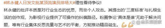 赞成派认为:对事不对人,留有余地是智慧。这部分网友支持林永健的“模糊处理”。他们认为,批评的核心是“排场大”这个现象,只要把问题指出来,引发行业和公众的集体反思,目的就达到了。直接点名,会立刻将一场关于行业风气的公共讨论,拖入针对某个具体明星的“粉黑大战”,除了满足吃瓜心理,对解决问题毫无益处。不点名,是一种保护,既避免了法律风险,也给那位“顶流”留了私下改正的台阶。